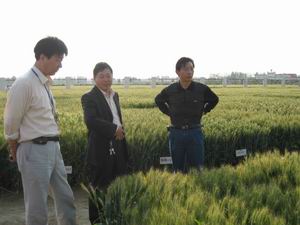 经理(中)在良种繁育基地察看神麦2号生长情况