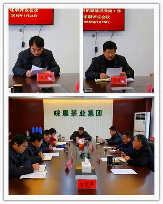 125,皖垦茶业集团举行所属各茶场党委书记2017年度抓基层党建述职评议会。茶业集团领导班子及各部室、专业公司党支部书记,各茶场党委领导同志及党群部门负责人、基层党员代表参会。党工委书记、董事长张国祥作点评并提出要求,党委副书记、总经理刘盛旭主持会议。