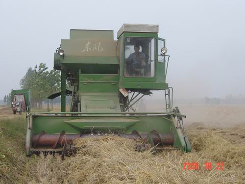 眼下,大圹圩农场正集中力量,人机并举,全力以赴加快水稻晒割脱粒进度。 图为:割晒机在田间割晒水稻和“东风”收割机对已晒干稻把进行捡拾脱粒的场景。